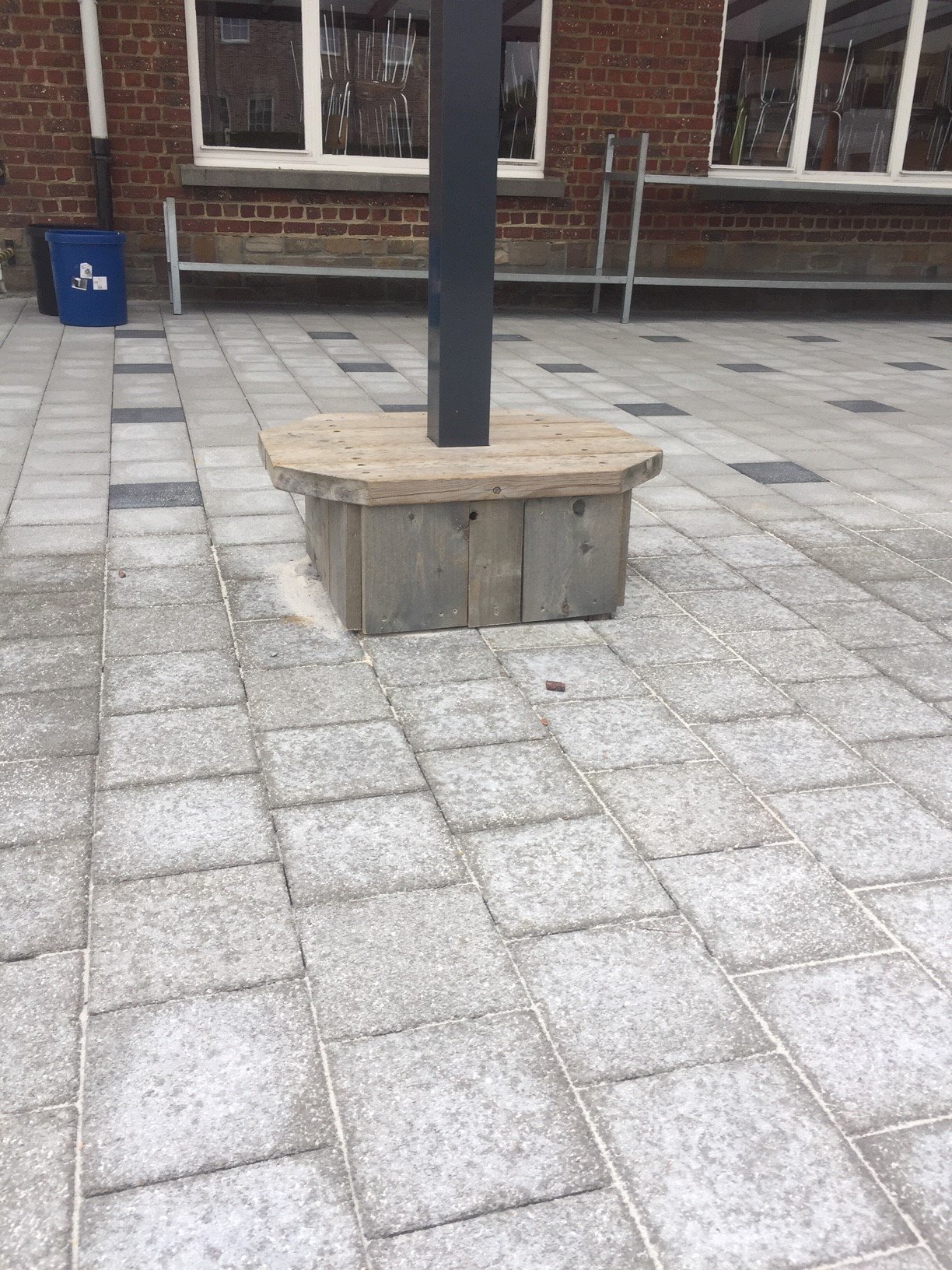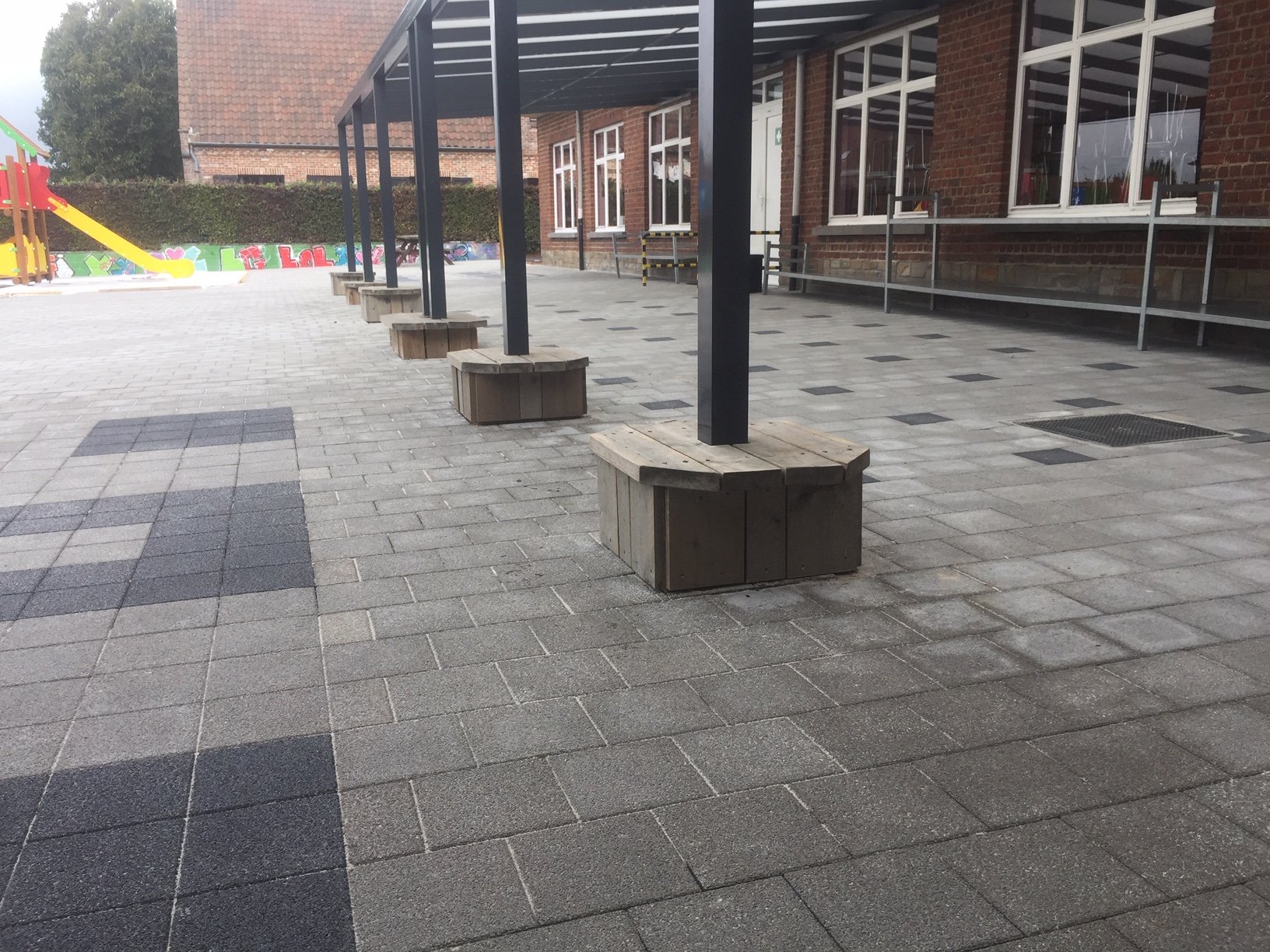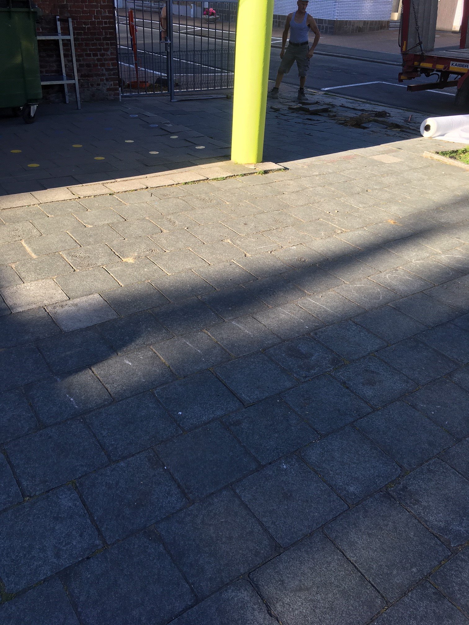 De oude betonklinkers en betontegels werden opgebroken en vervangen door nieuwe poreuze waterdoorlatende betonklinkers (22 x 22 x 8 cm).